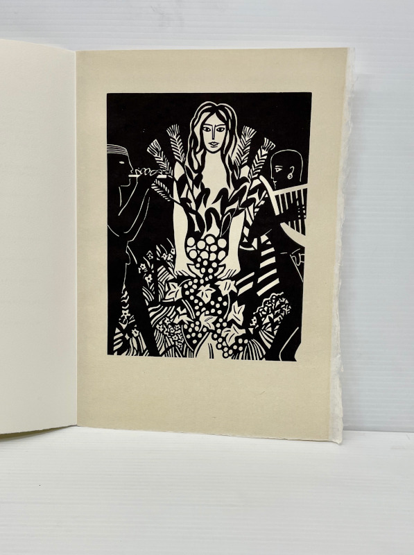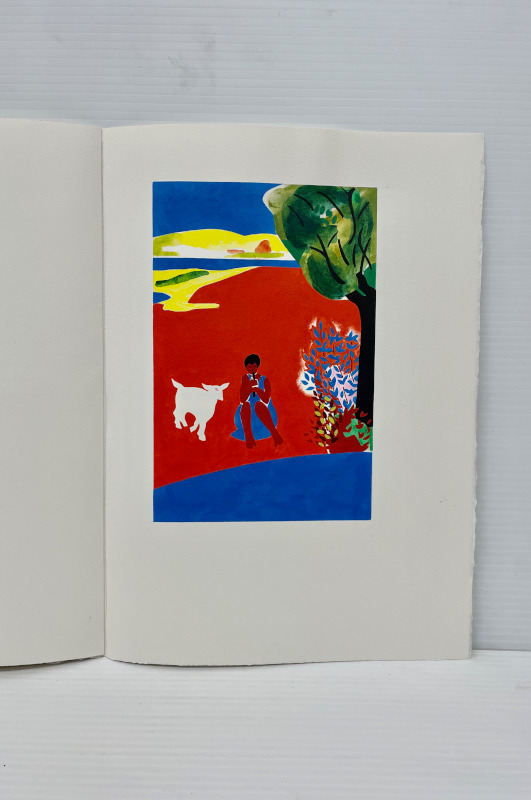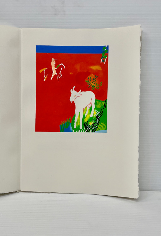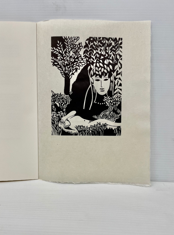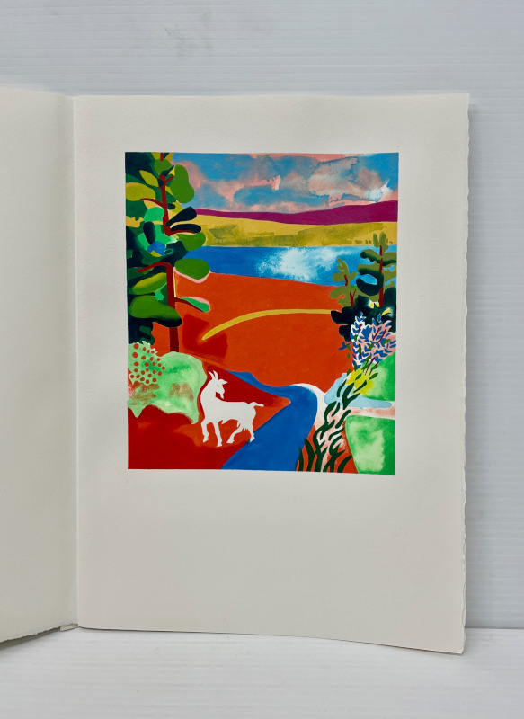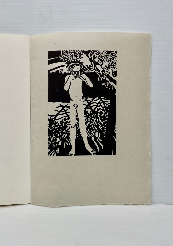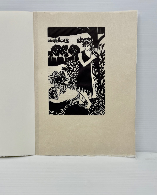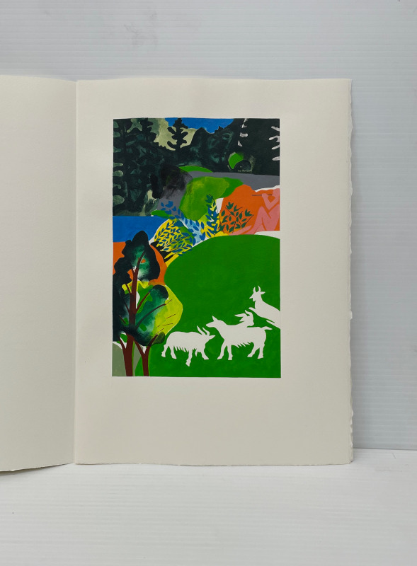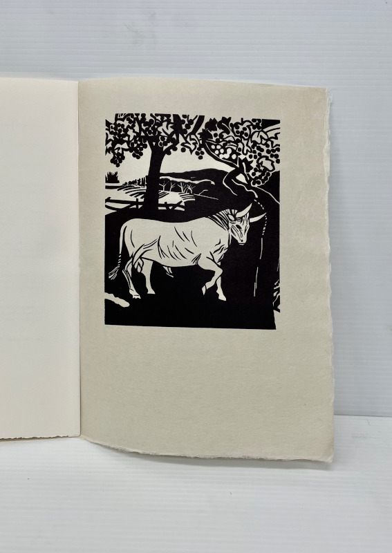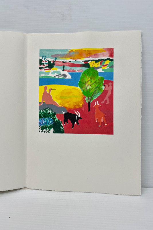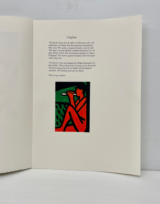 For our 12th publication available in the summer of 2025, we have selected 8 bucolic poems from the Idylls of Theocritus. The translation is by the English poet Robert Wells. Theocritus is considered to be the inventor of the pastoral tradition, and as our first publication was Virgil’s Eclogues, after all these years, I felt drawn to return to this theme. This time the pastoral illustrations are based on works that I have done over the past several years in a part of northern Ontario very dear to me. The ruggedness of the land, with its unusual clarity of light, is similar to the experience of drawing and painting on both the island of Crete and in the south of France. The challenge was to take this northern imagery and adapt it to a southern landscape. There is a pochoir for each of the 8 poems and one for the title page and colophon. These are complex and generally evoke the mood of the poetry. The 8 woodcuts are more specific depicting an image from each poem. The book has 75 pages including blanks. The page size is 14 1/2 inches in height and 10 1/2 inches in width or 36.8 by 26.6 mm. The type is 16 point Bembo printed on 200 gsm Arches Cover. The woodcuts are printed on Oguni Fudagami. The book was jointly conceived by Butler and Bachinski. The pochoirs were designed and printed by Bachinski. The woodcuts were made by Bachinski. Both the woodcuts and the printing were done on a Vandercook Universal1 by Butler with Bachinski assisting. The binding by Butler is quarter bound in cloth and Kizuki Somegami Red paper with a linocut on the cover. The book is housed in a cloth covered slipcase. We have printed 30 copies for sale and the price is $3,250.00 USD wbachinski1@gmail.com www.shantybaypress.com